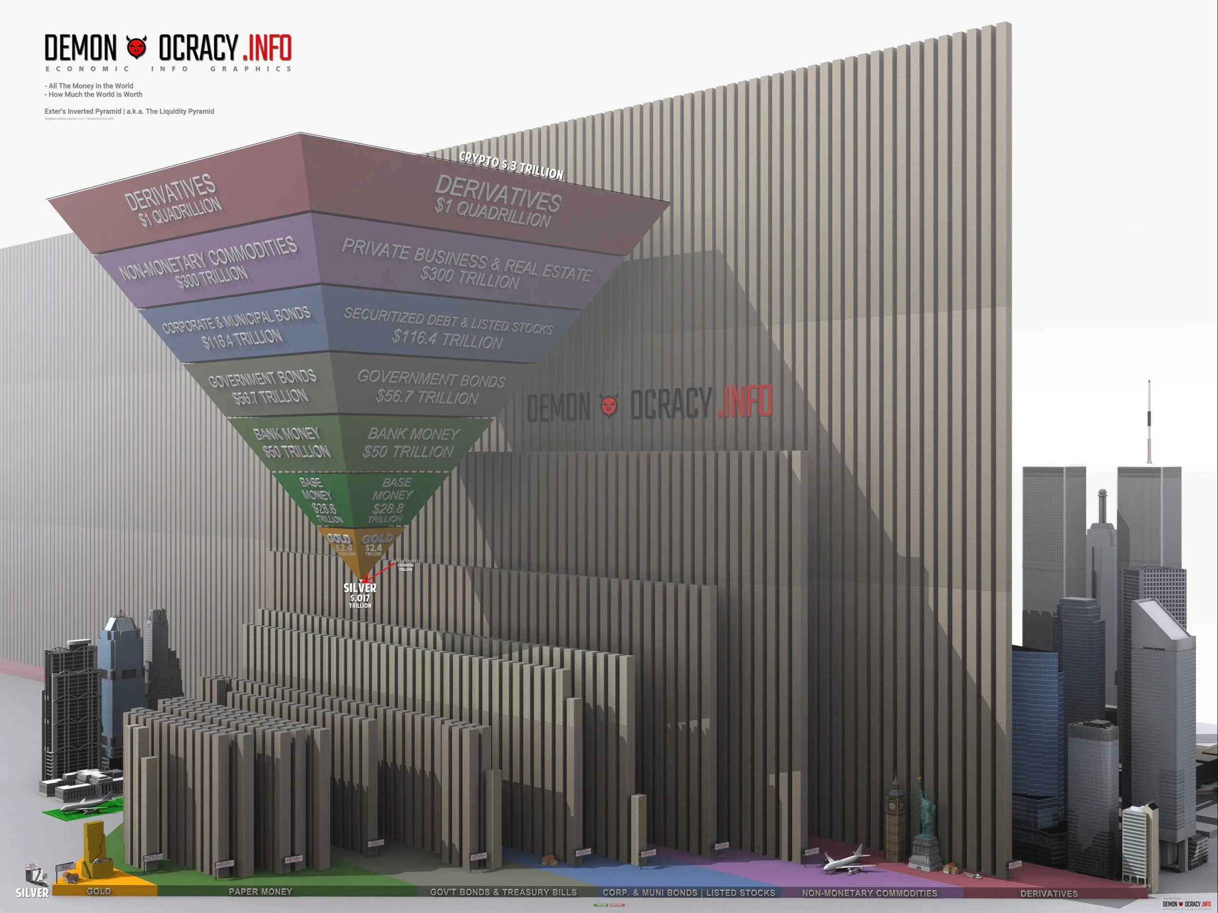 The pyramid shows the asset classes based on risk and size, with silver at the tip. It also shows the absurdity, unsustainability, and the irrational illusion of “wealth” based on nothing but paper. [See infographic above for more]